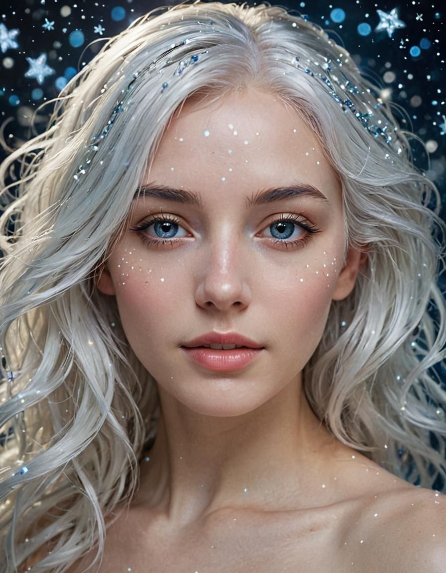 A striking picture of a woman with half her face cerulean blue and the other half a galaxy of twinkling stars. This digital artwork captures an otherworldly, ethereal beauty.