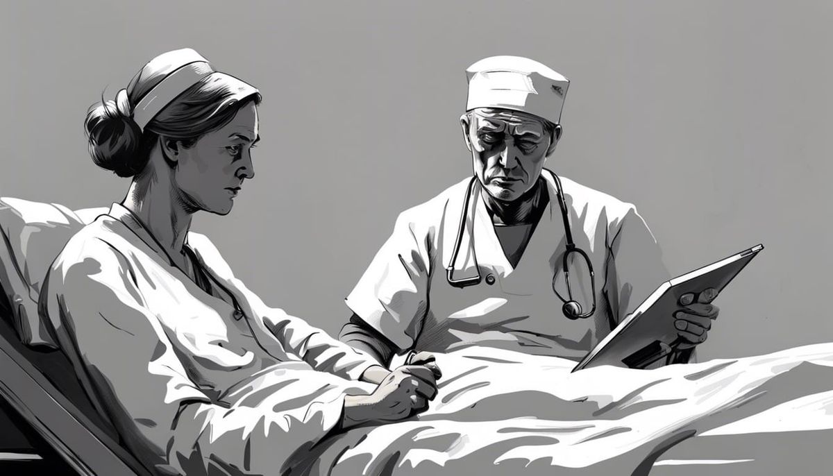 A grayscale image shows a patient in a hospital bed speaking with a nurse holding a clipboard. The scene depicts a sterile setting with themes of finance and bureaucracy.