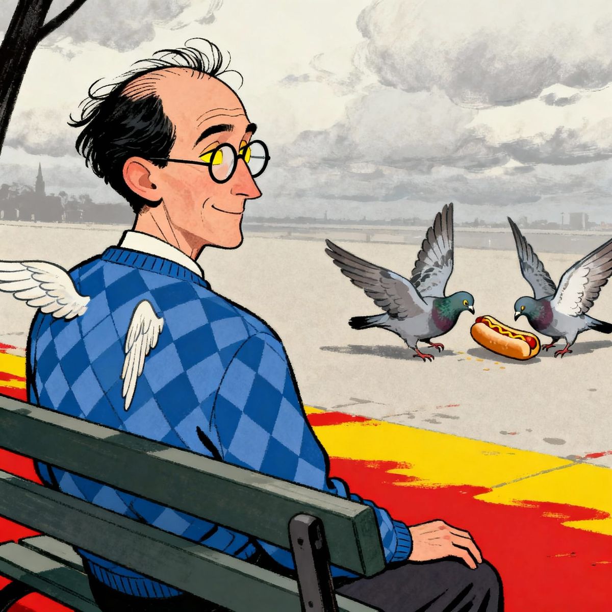 A man with unique pigeon wings sits on a park bench, watching pigeons. Rendered in muted desaturated colors with bold red and yellow accents, evoking a blend of melancholy and quirky charm.