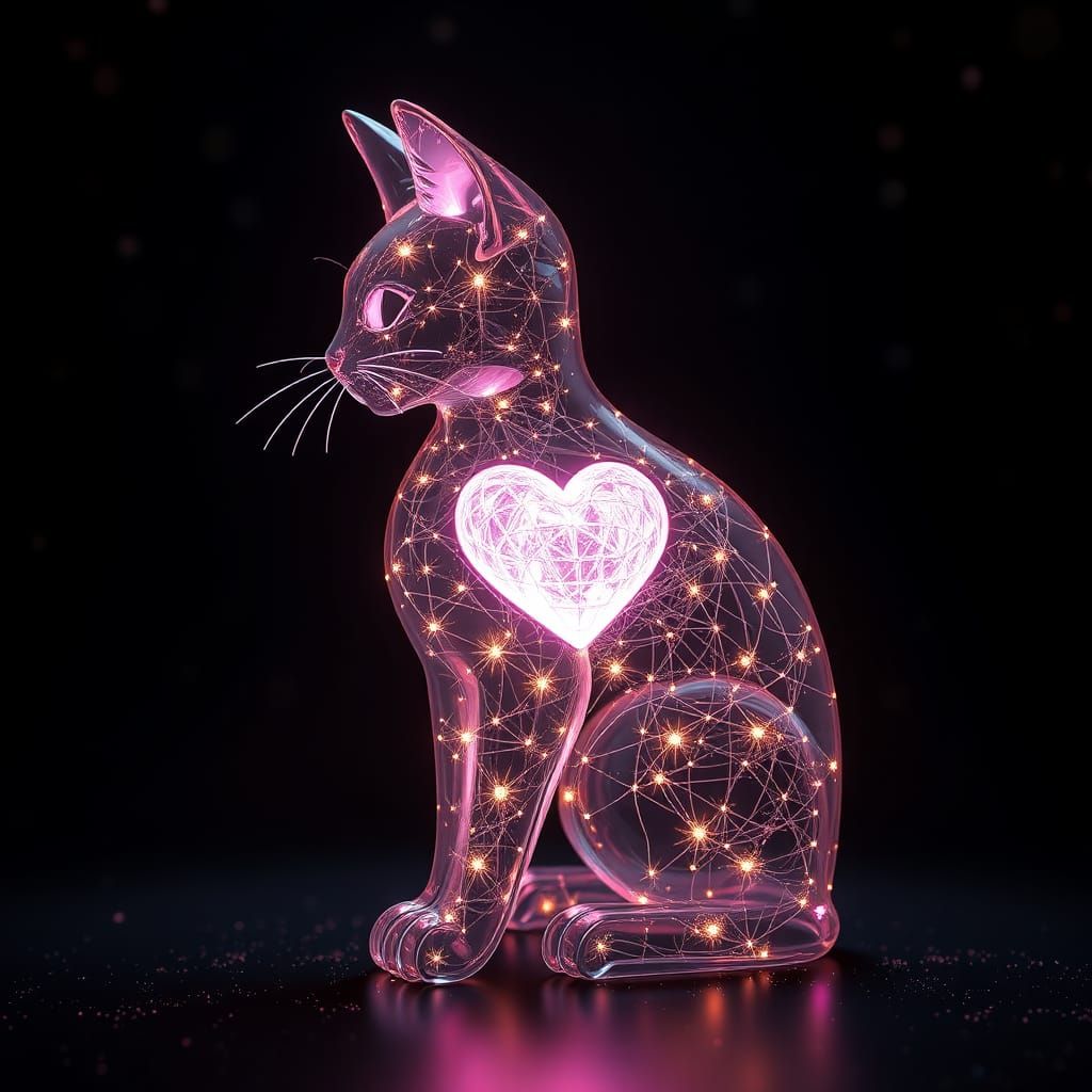 A captivating image of a translucent cat-shaped lamp against a dark, twinkling backdrop. The lamp's glowing internal components and heart create an ethereal, magical ambiance, rendered in stunning detail as 8k digital art.