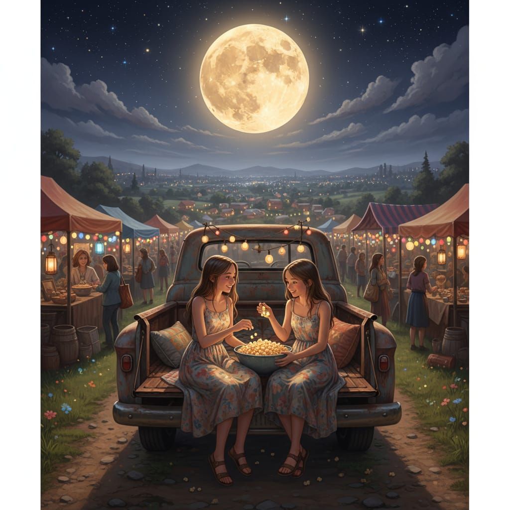 This image shows two teenage girls enjoying popcorn in a vintage truck. Warm moonlight and vibrant market lights create a colorful atmosphere, rendered with intricate details in a hyperrealistic style.