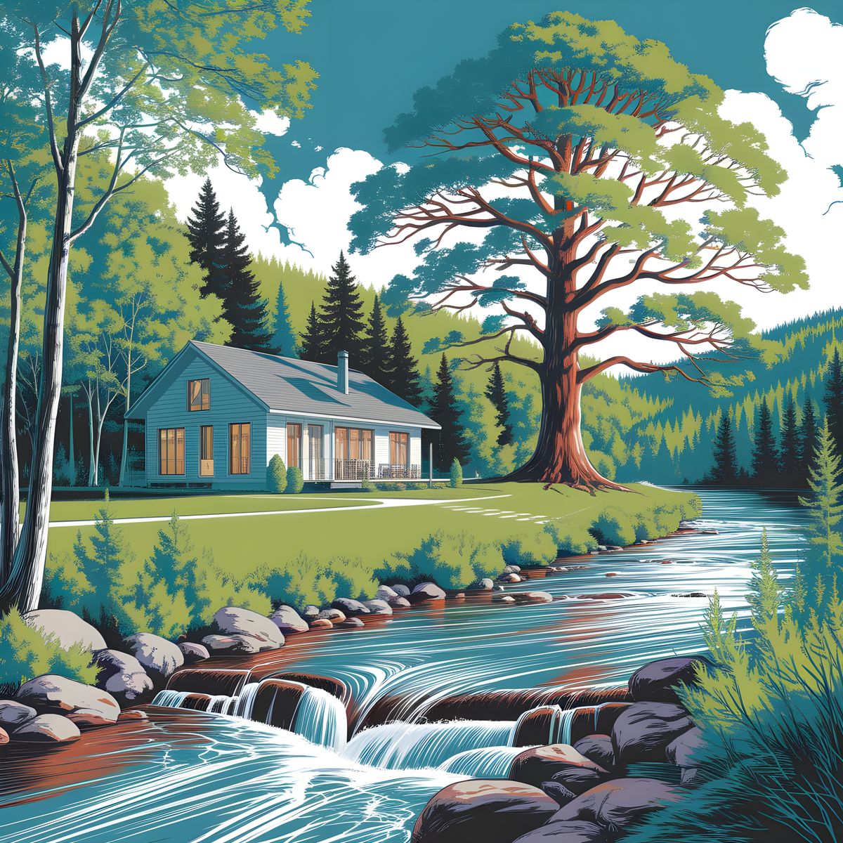 A striking picture of a modern cabin in a vibrant summer landscape. The cabin is nestled among lush woods, with a sparkling river flowing nearby, rendered in vivid contrasting colors.