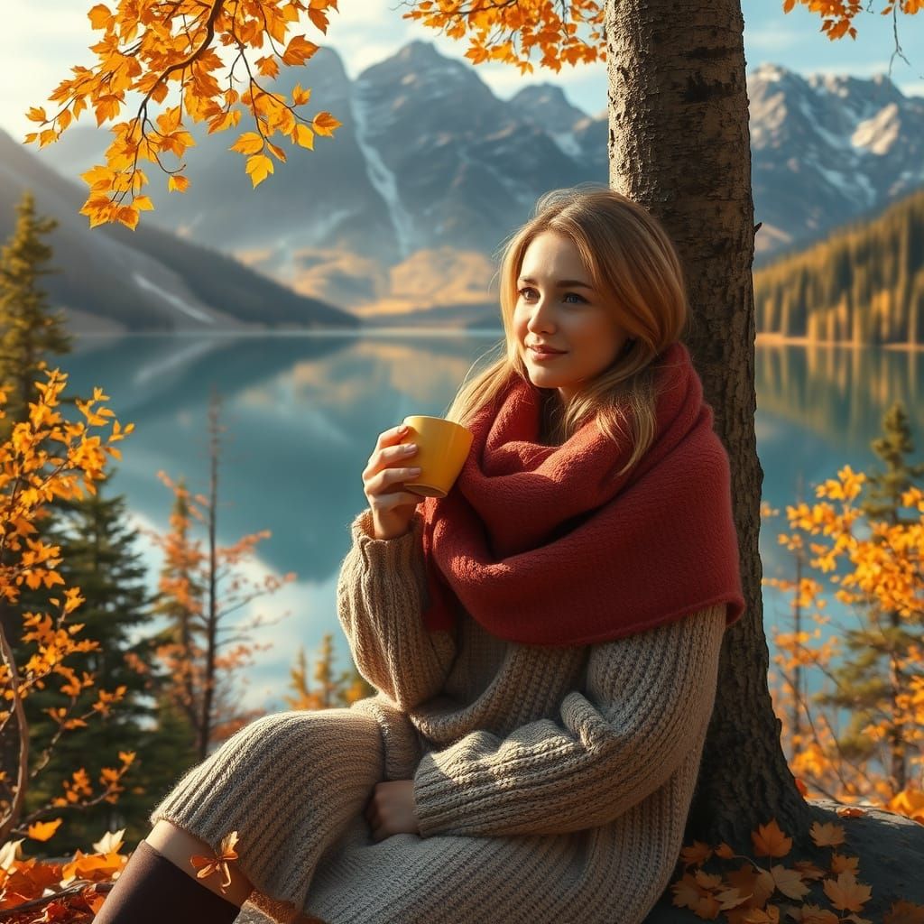 A serene image of a woman enjoying tea in an early autumn forest. A crystal lake reflects mountains in the background. Evokes classic landscape painting with atmospheric lighting.