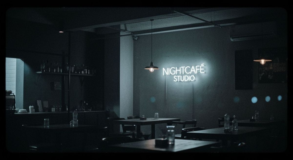 This image shows a moody, atmospheric coffee shop at night, featuring deep shadows and cool gray tones. The cinematic film still aesthetic is enhanced by subtle grain and bokeh effects.