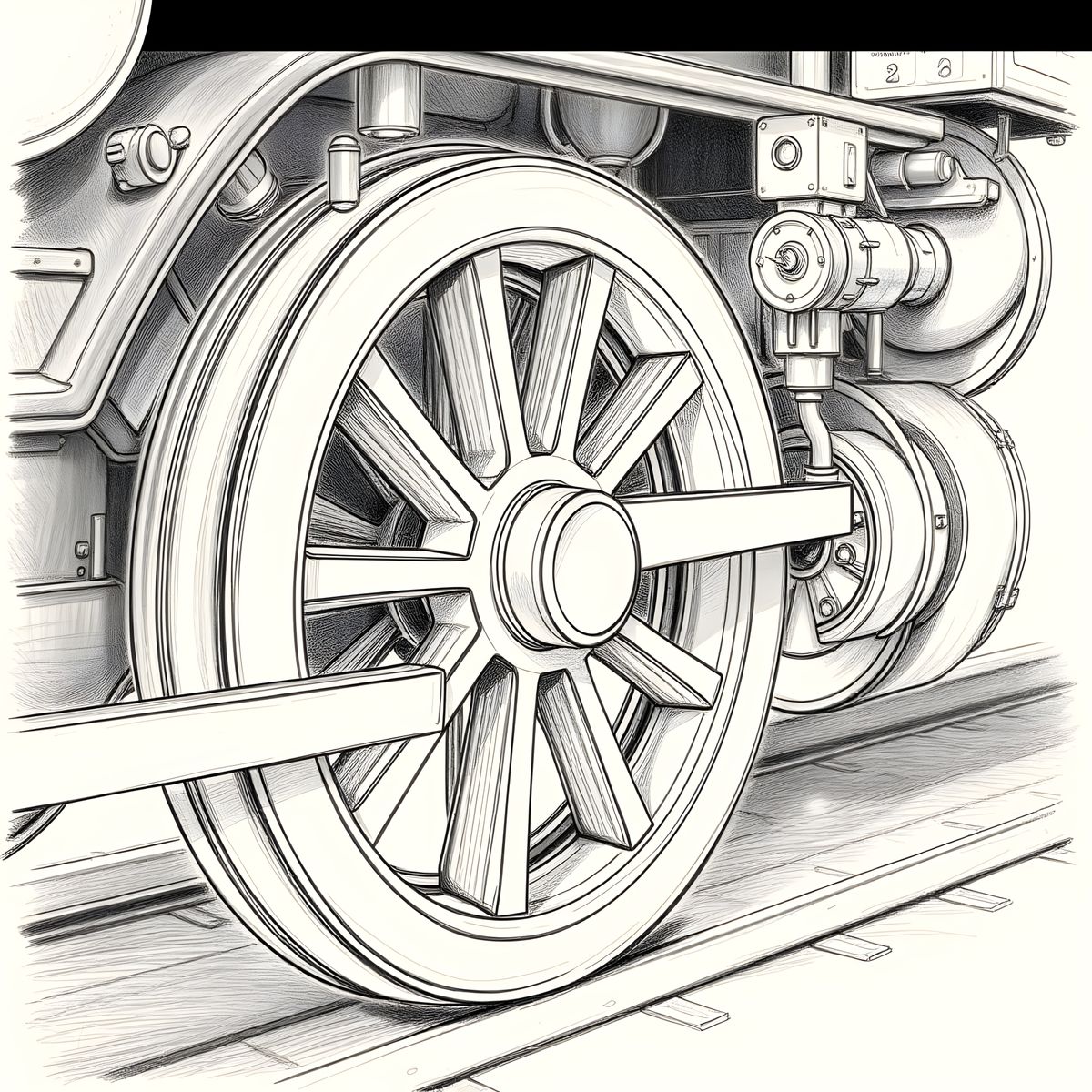 This image features a detailed charcoal pencil sketch of a steam locomotive's intricate wheels, showcasing the mechanical beauty of vintage train engineering.