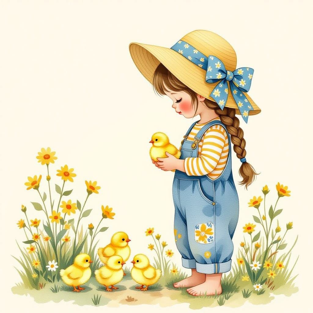 This charming illustration depicts a young child in vintage overalls and a floppy hat, gently holding a tiny chick. Soft watercolor tones evoke a classic children's book aesthetic.