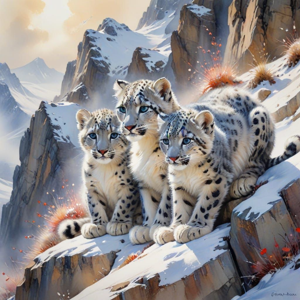 A watercolour painting of snow leopard cubs nestled on a cliff path. The artwork evokes impressionist techniques with expressive colours and ethereal stylization, harmoniously blending chaos and beauty.