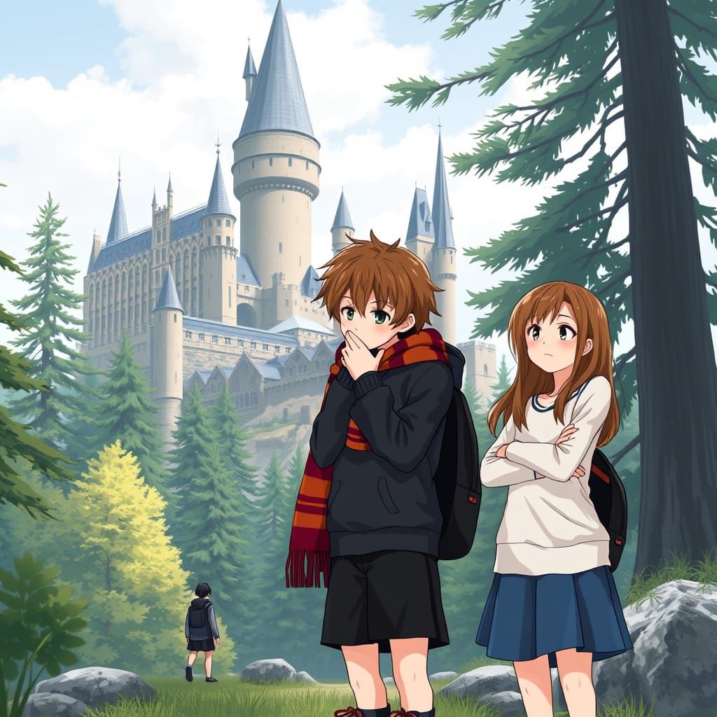 This image shows two young girls in blue skirts and white tops near Hogwarts. Harry Potter is whispering to one girl with blond hair while the other, with brown hair, looks confused, in a scenic, anime-inspired style.