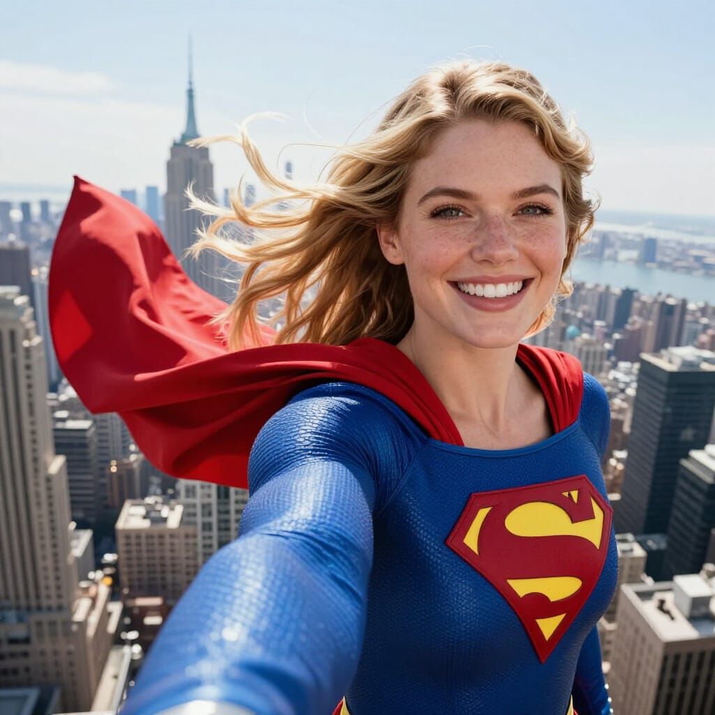This image captures Supergirl taking a selfie high above Manhattan. Her joyful face fills the frame, with the detailed city skyline below, rendered in a crisp, high-altitude sunny aesthetic.