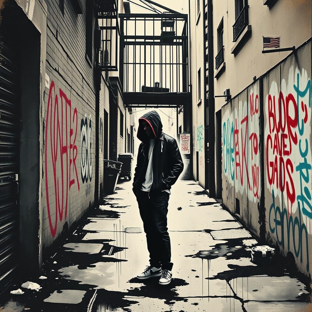 A striking picture of a person contemplating life amidst urban chaos. The artwork is rendered in a street art style, using stencils and muted colors to evoke themes of social commentary.