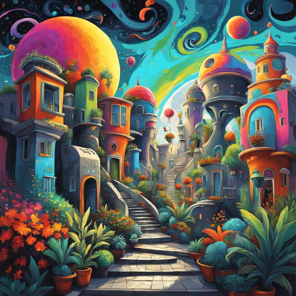 This image displays brightly colored stucco buildings and green plants beside a dark path, set against a surreal sky with swirling patterns and glowing celestial elements, in a vivid, abstract style.