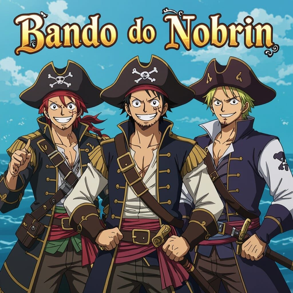 This image shows a vibrant anime-style pirate crew logo. The adventurers are smiling, wearing detailed outfits, with "Bando Do Nobrin" in ornate, shadowed, and glowing font against a sea background.