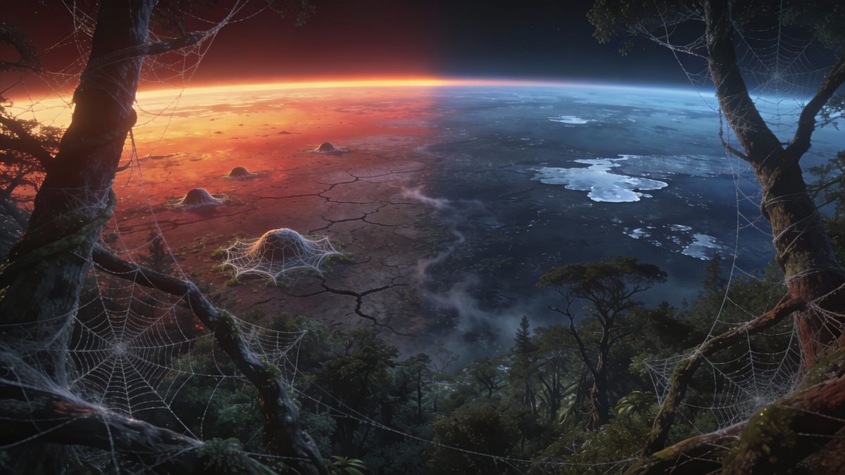 This image shows a realistic panoramic view from above an alien planet's twilight zone. It features a dense forest, cracked barren ground, ice patches, and a permanent sunset sky.