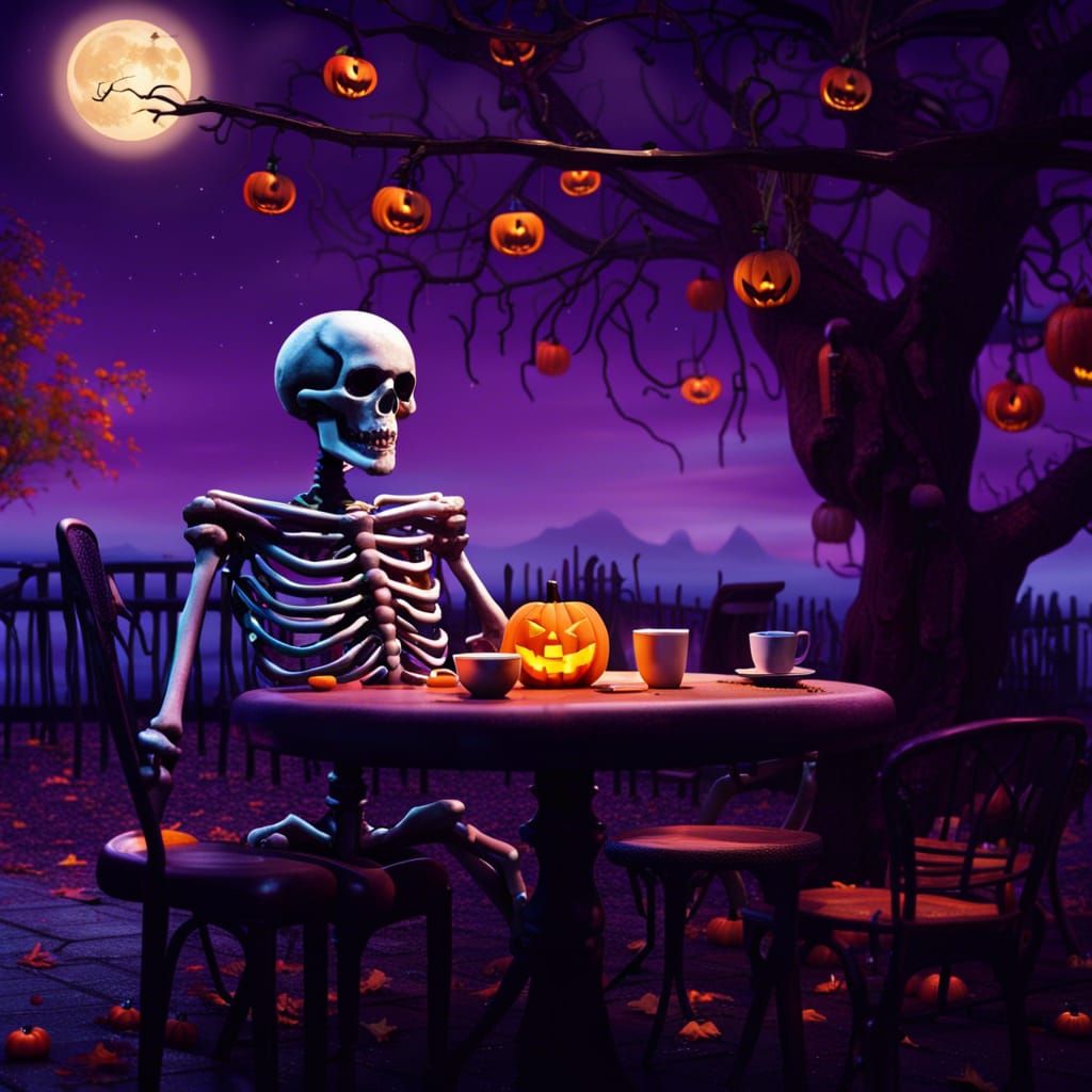 A detailed matte painting of a skeleton enjoying pumpkin pie and coffee at an outdoor Halloween cafe. The scene is set at midnight under a purple sky with a full moon.