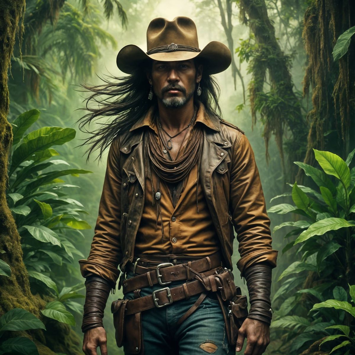 This image shows a cinematic film still of a cowboy standing in a lush jungle environment, with a strong sense of atmosphere and dramatic lighting, reminiscent of a 35mm film shot with a vintage aesthetic.