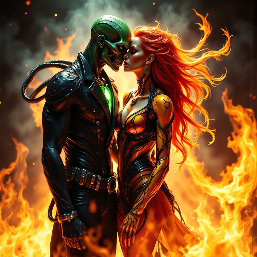 This image shows Abe Sapien and Firebird passionately kissing amidst swirling steam, with flames surrounding only her. The artwork features bold lines, dark shading, and dynamic colors, in a comic book aesthetic.