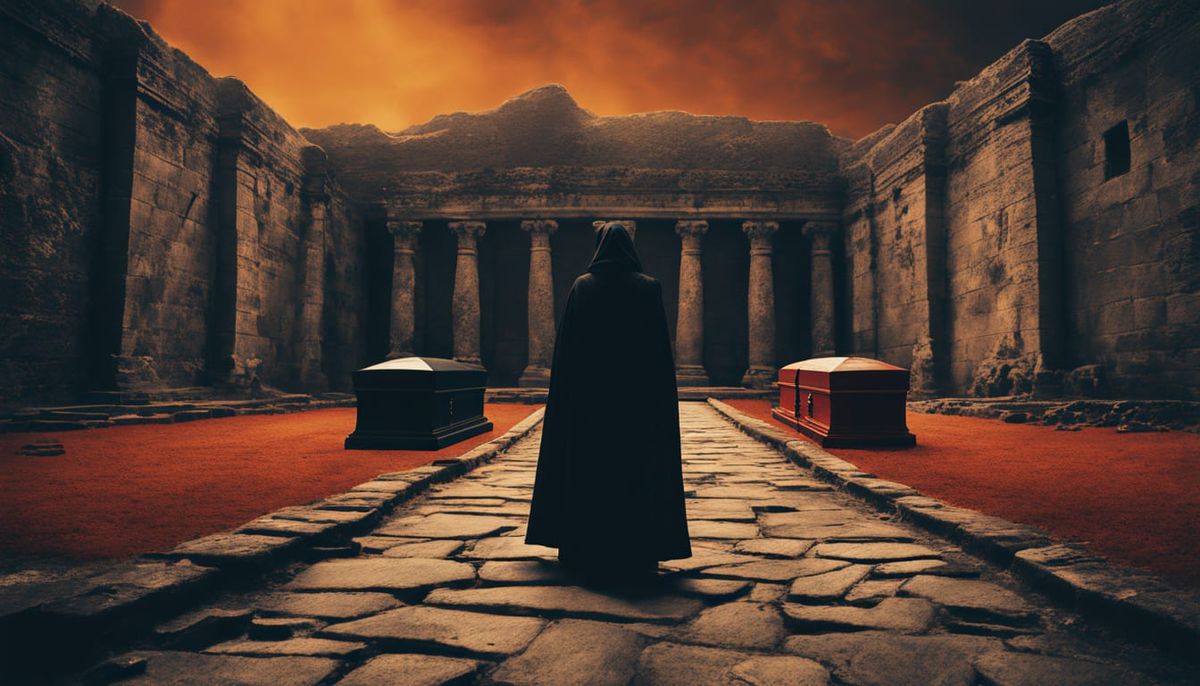 A dramatic cinematic shot of a dark figure approaching a black coffin in an ancient crypt. The image has vibrant colors, ominous shadows, and blood-red moonlight, in a film noir style.