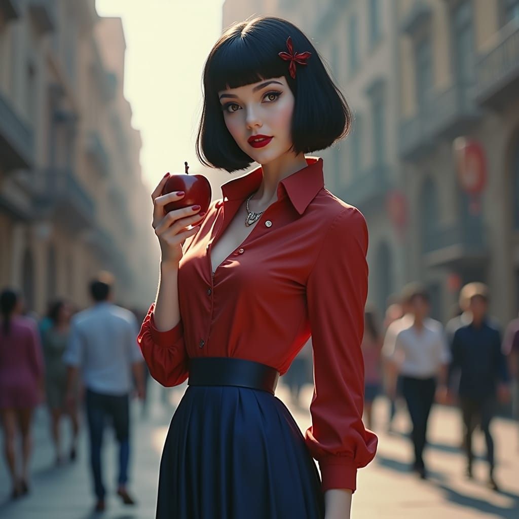 This image captures Snow White in a stunning blue dress, with sleek black hair, a small red barrette, and bold red lips. Shot in a cinematic film style with rich colors and film grain, this portrait features a luxurious 35mm aesthetic.
