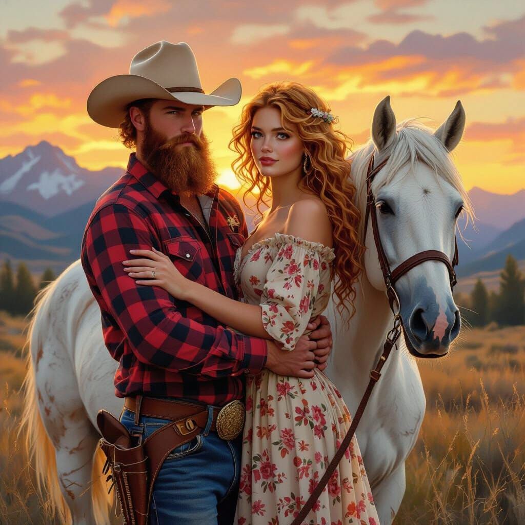 A striking picture of a blond, bearded cowboy holding a red-haired woman at sunset. The scene features a white paint horse and evokes a romantic, textured and colorful aesthetic. A vibrant digital rendering.