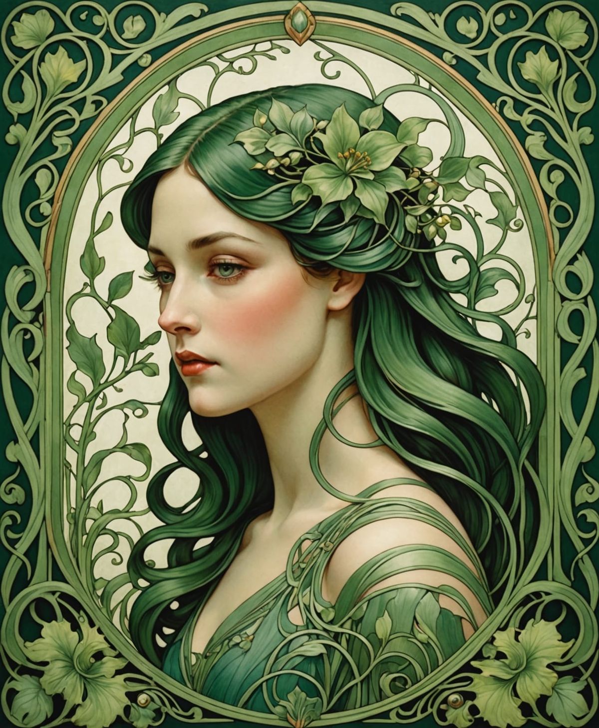This image showcases elegant Art Nouveau design with dominant green hues. It features flowing botanical patterns and organic frames, embodying nature's graceful forms.