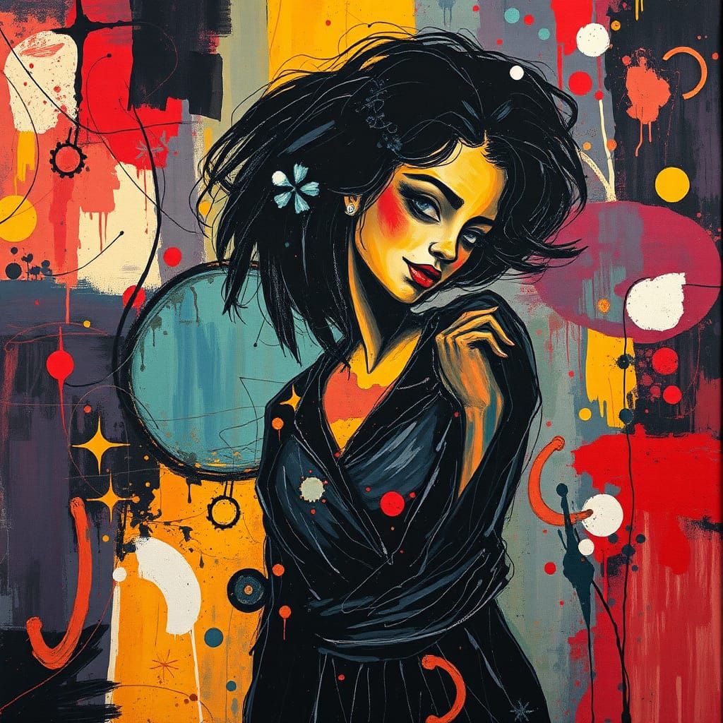 A vibrant expressionist portrait of a contemplative woman. The artwork uses thick layers of textured paint in a colorful neo-impressionist style, reminiscent of abstract jazz.