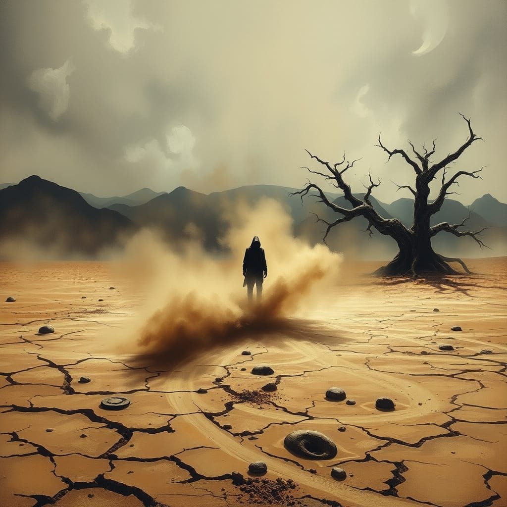 This surrealist oil painting depicts a lone figure fading into dust on a desolate plain. Dramatic lighting and desaturated colors emphasize themes of existential dread and the passage of time.