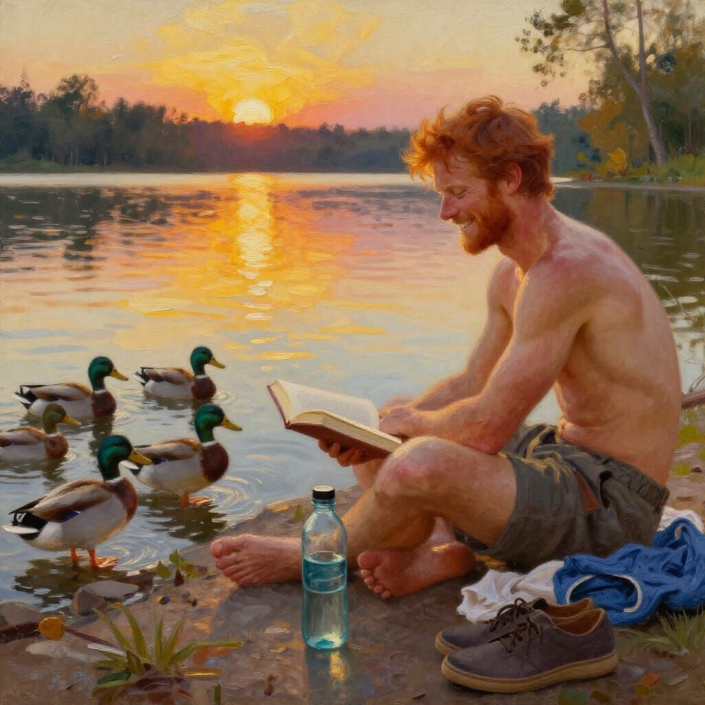 This image shows a fit, shirtless man relaxing by a lake at sunset. Rendered in a vibrant oil painting style with rich textures, evoking serene contentment.