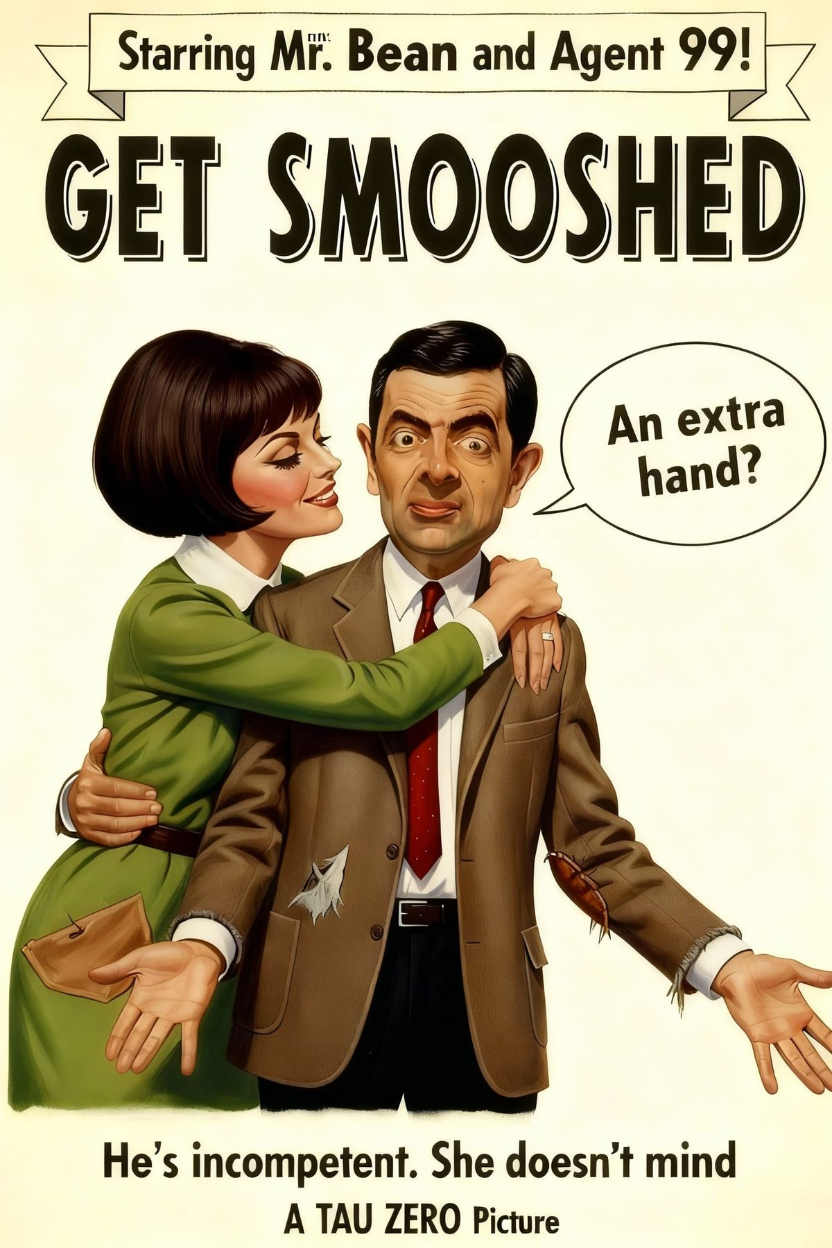 This image is a humorous 1960s movie poster featuring Mr. Bean and Agent 99 in a comedic embrace. The painting style uses exaggerated caricatures for a quirky, spoof film effect.