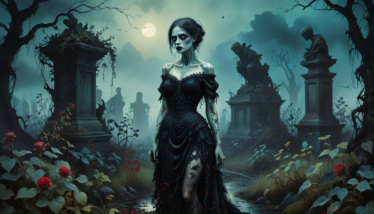 A striking picture of a zombie woman in a tattered dress walking through a ruined garden. The watercolor art style emphasizes realism, cinematic lighting, and fine details to create a macabre aesthetic.