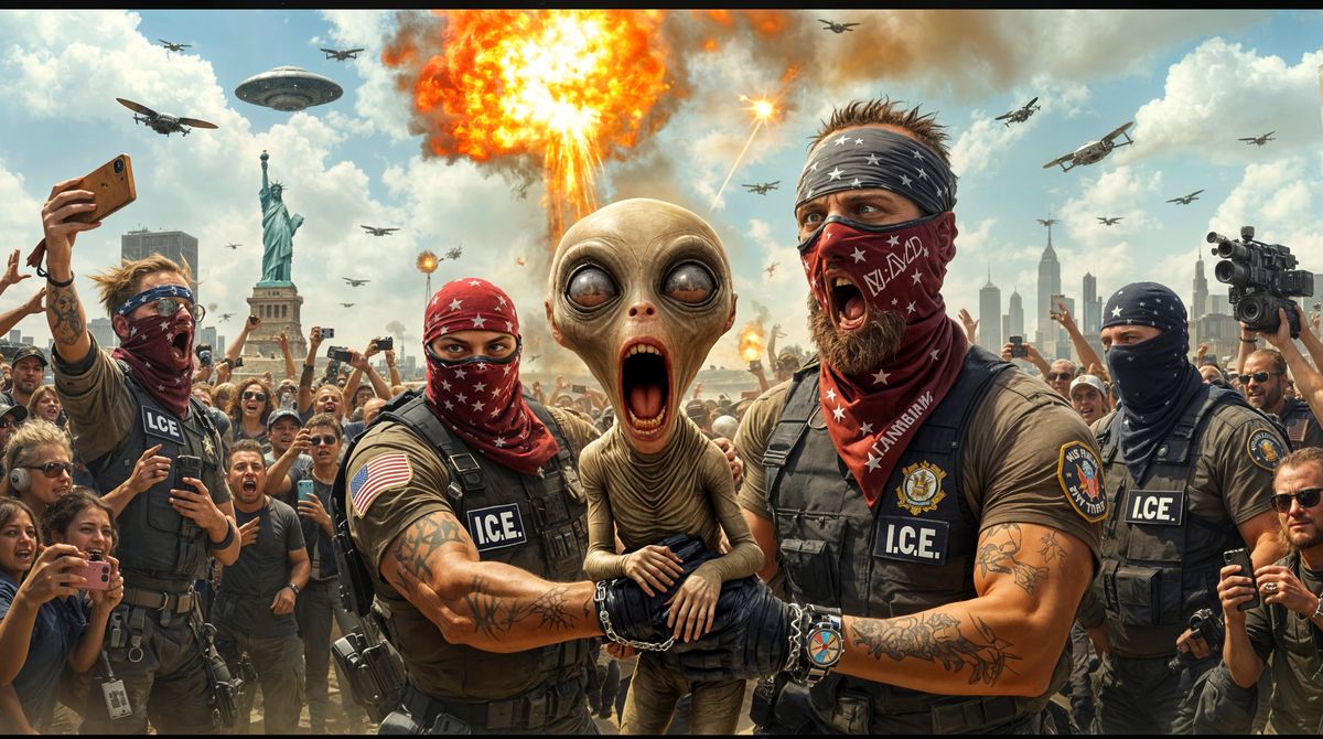 This image shows a chaotic scene with caricatured figures apprehending a screaming alien. Drones attack a UFO in the background, with the Statue of Liberty visible in the distance. The artwork is in a Neill Blomkamp style.