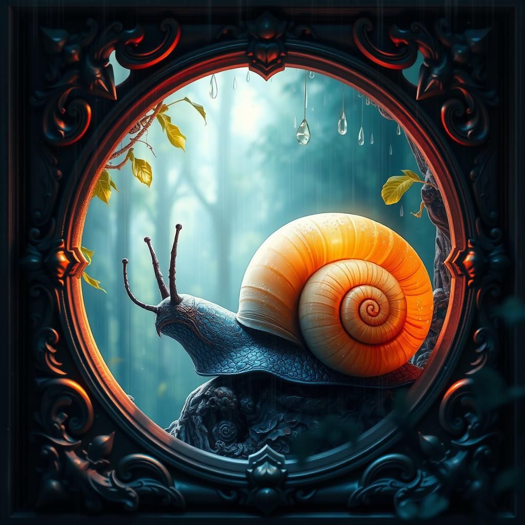 This image shows a snail in a forest with rain. The snail appears translucent, and the scene is rendered with deep colors and intricate details, in a fantastical digital painting style.