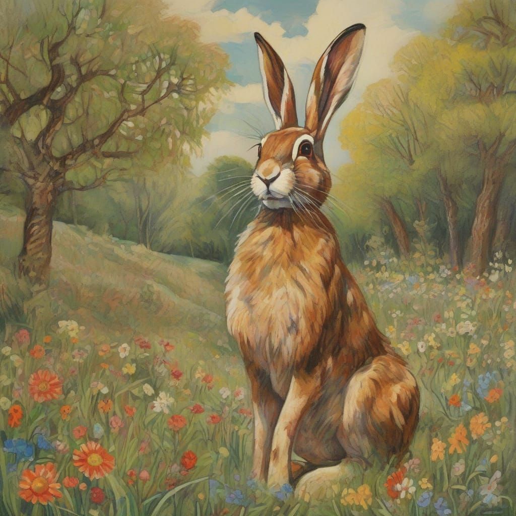 This vibrant oil painting depicts a mother hare celebrating in a lush forest clearing, surrounded by blooming flowers and warm sunlight, in a style reminiscent of folk art and whimsical illustration.