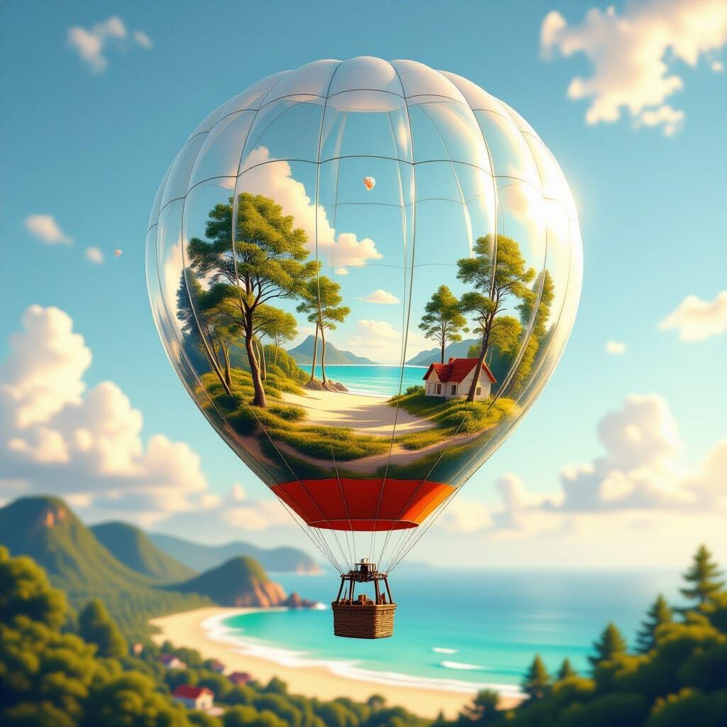 A breathtaking image of a transparent hot air balloon carrying a miniature world inside. The landscape features forests, beaches and tiny houses, with photorealistic lighting in a retro science fiction style.