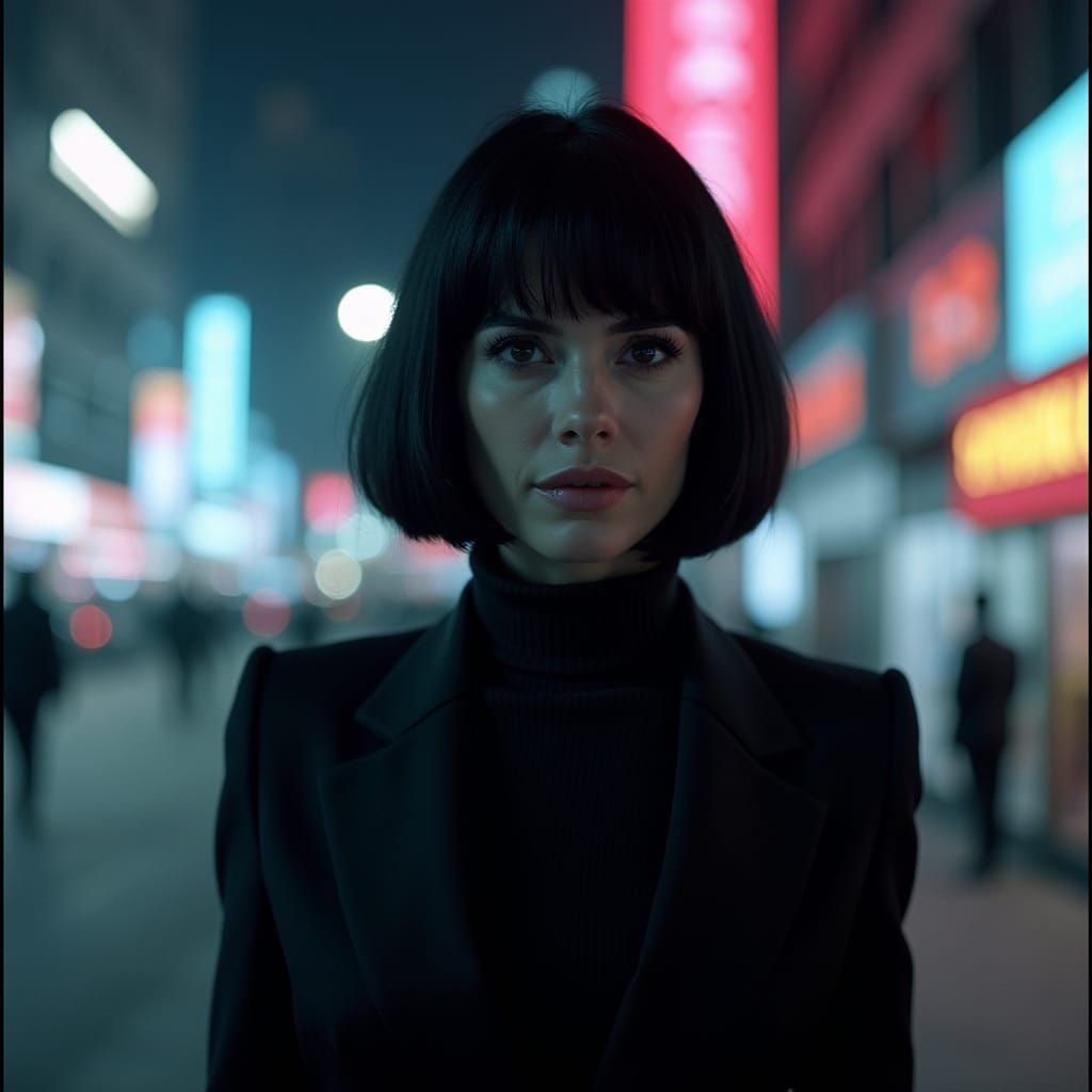 A digital portrait of a businesswoman in a dark suit against a neon city backdrop. Shot with dramatic lighting and film grain in a cyberpunk aesthetic with gritty realism and stylized flair.