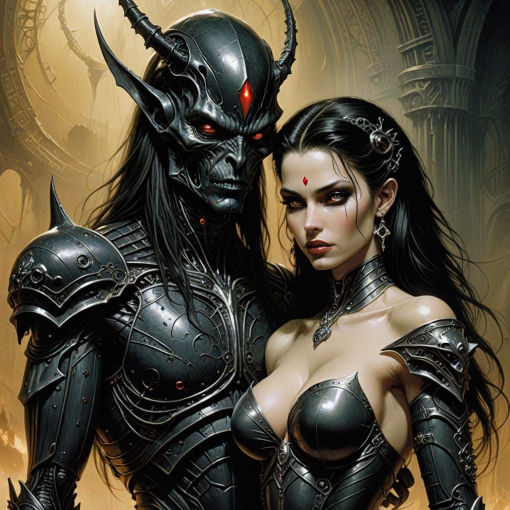 A digital painting showing a woman embracing an alien cyborg prince. The image has a dark, romantic aesthetic.