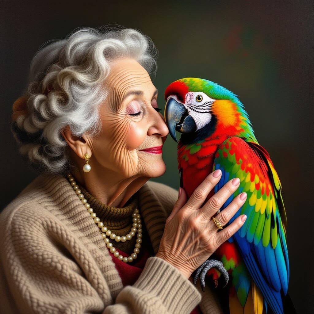 This image shows an elderly woman affectionately kissing her Amazon parrot. Rendered in a photorealistic style, the artwork captures intricate details and emotional depth in a hyperrealistic aesthetic.