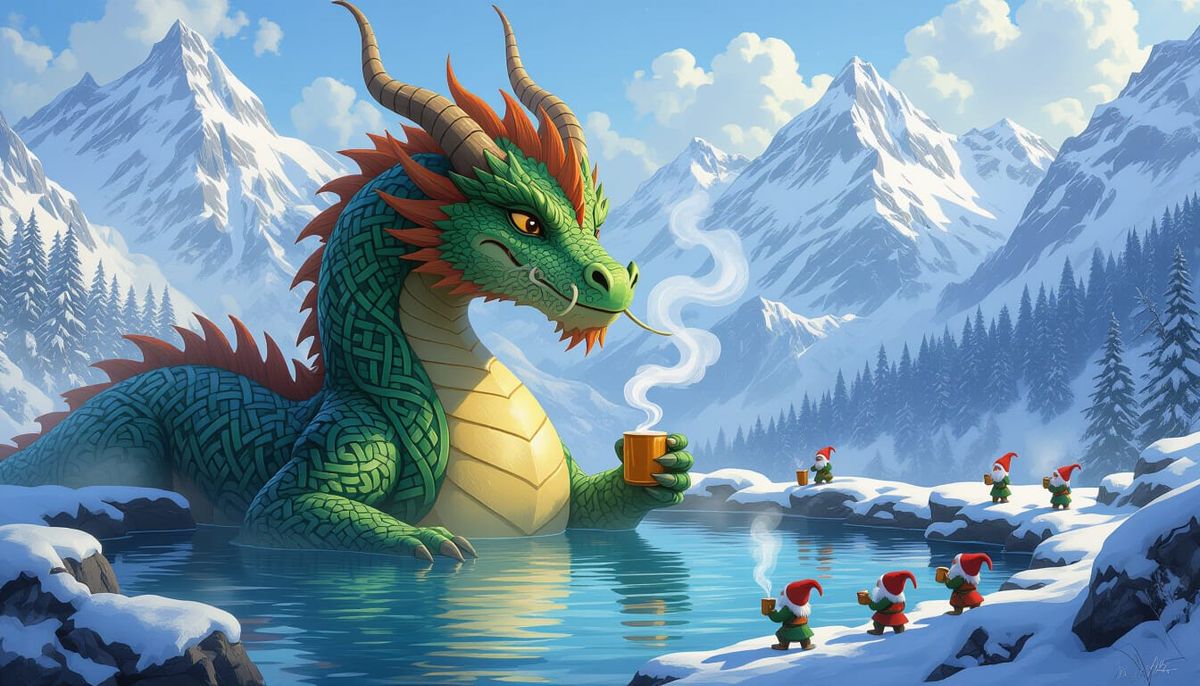 This image shows a large, benevolent dragon adorned with Celtic designs enjoying a hot spring in the mountains. Tiny gnomes play nearby, offering the dragon tea in an Alphonse Mucha-inspired Art Nouveau style.