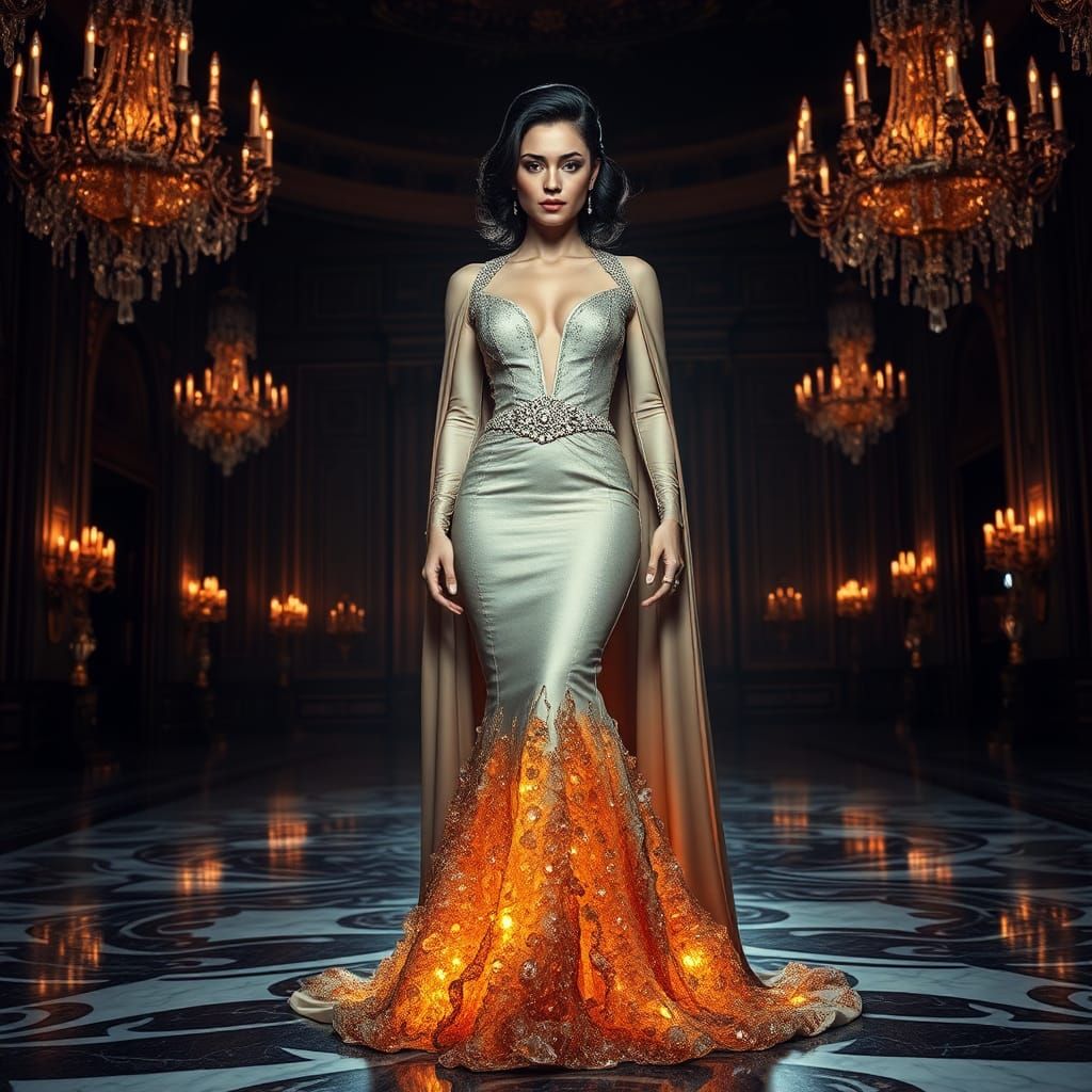 A stunning image of a woman in an ornate ballroom. She wears a gown with a cinched waist and crystalline skirt, in a moody, cinematic atmosphere with dramatic lighting. This image evokes high-fashion photography.