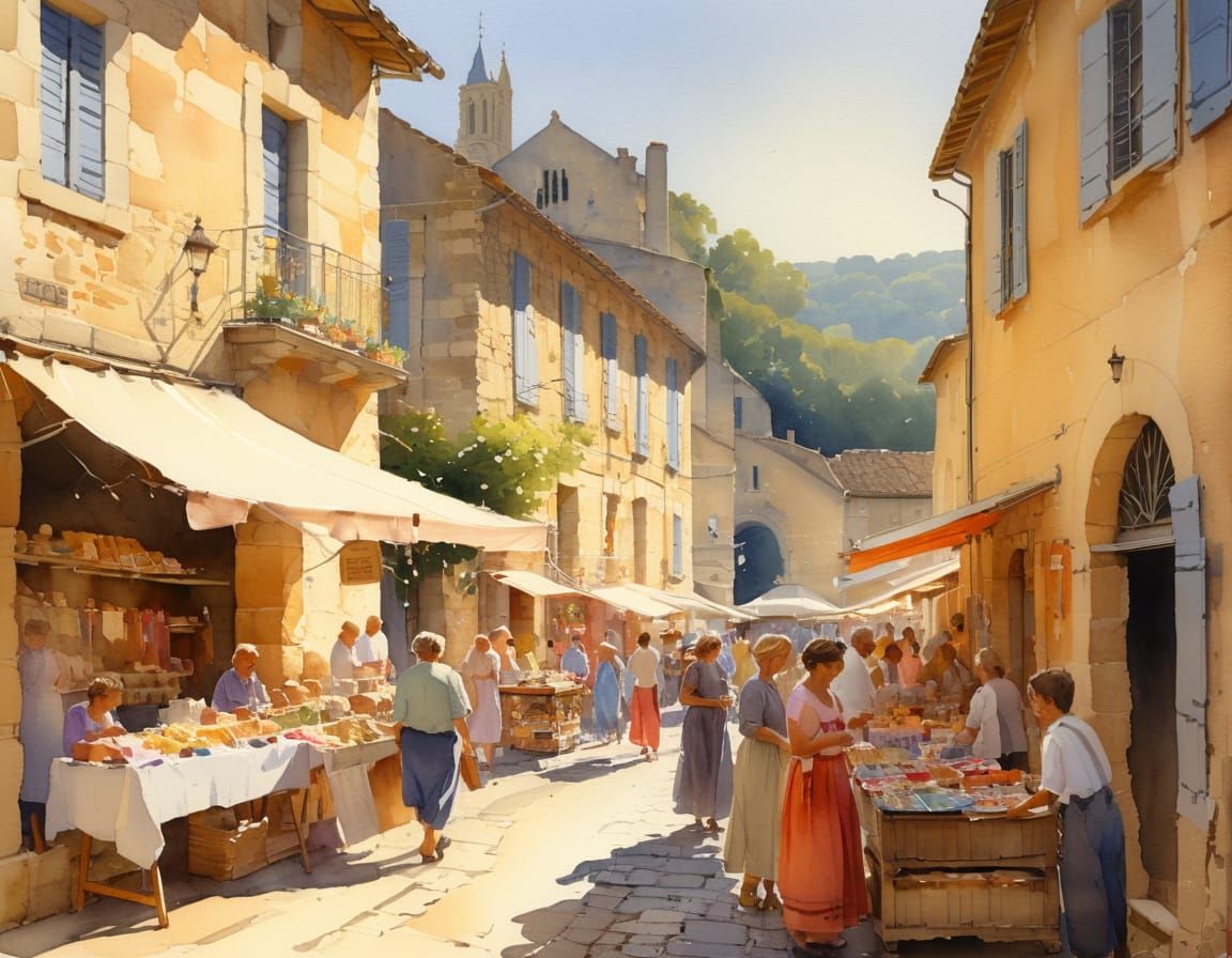 This image shows a vibrant marketplace scene in a quaint South of France village. Rendered as an impressionistic watercolor, the sun-drenched scene is full of life and layered textures.
