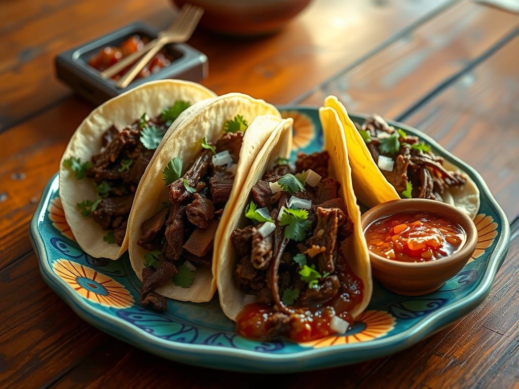 This image shows a mouthwatering display of steaming Barbacoa Tacos, fresh cilantro, and chunky salsa, set against a warm, rustic wooden table, evoking the lively atmosphere of a Mexican market.
