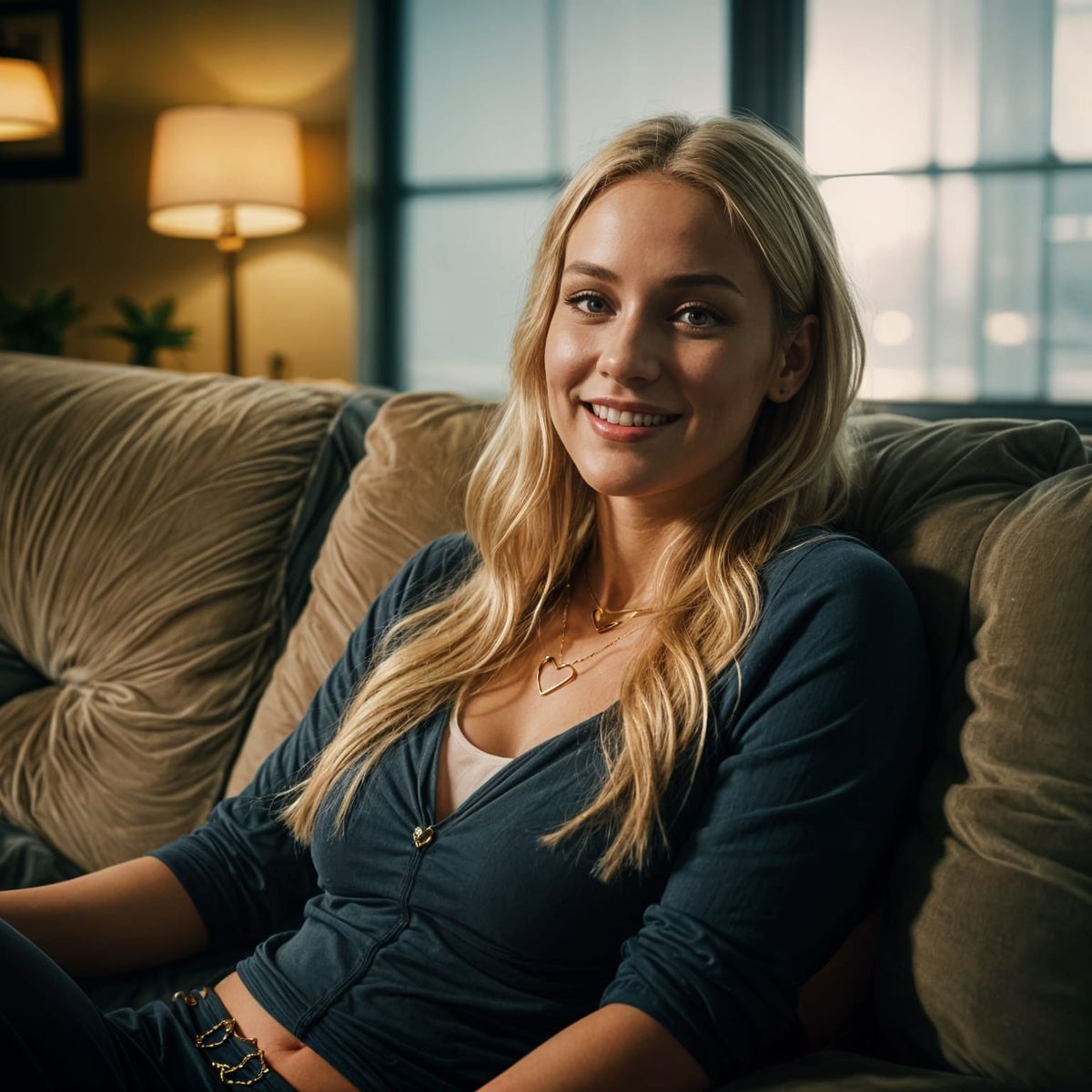 A striking image of an athletic blonde woman with long hair, wearing makeup and stylish attire, posing suggestively on a sofa. The image features a unique internal view of a golden heart within her womb.
