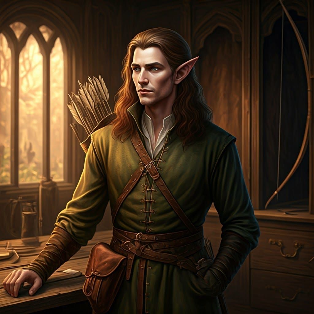 This image shows a skilled medieval elf merchant with 25 years of experience, expertly handling his craft in a traditional archery shop. The scene is a tribute to medieval craftsmanship and the art of archery.
