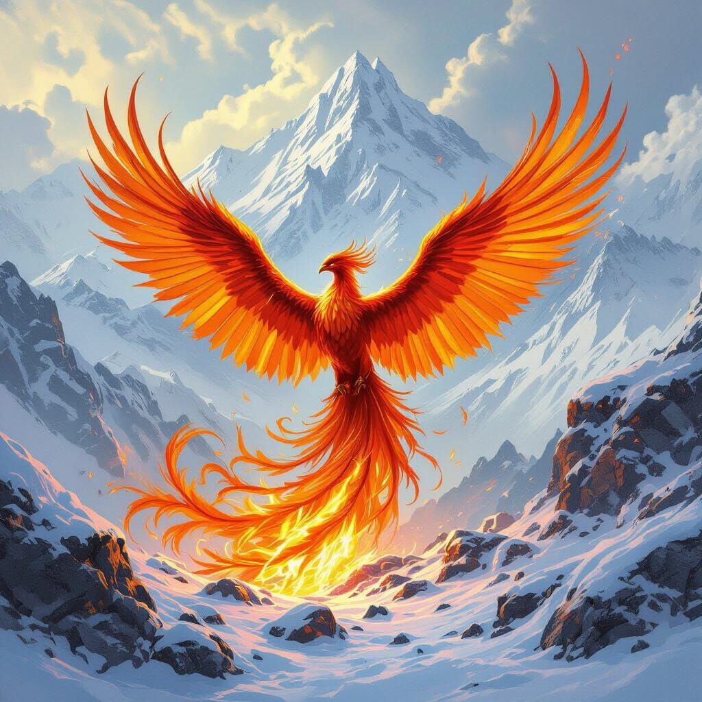 A striking picture of a phoenix ablaze, ascending from ashes, set against snow-capped mountains. The epic fantasy art style features dramatic lighting and rich textures.