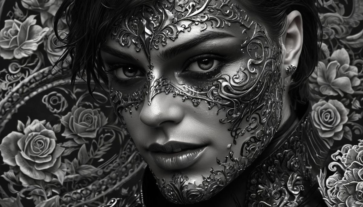 A dramatic close-up portrait of a dark fantasy champion in black and white leather, holding a foil with a rose. Ornate tattoos shimmer against deep shadows, rendered with intricate textures in a complementary color scheme.