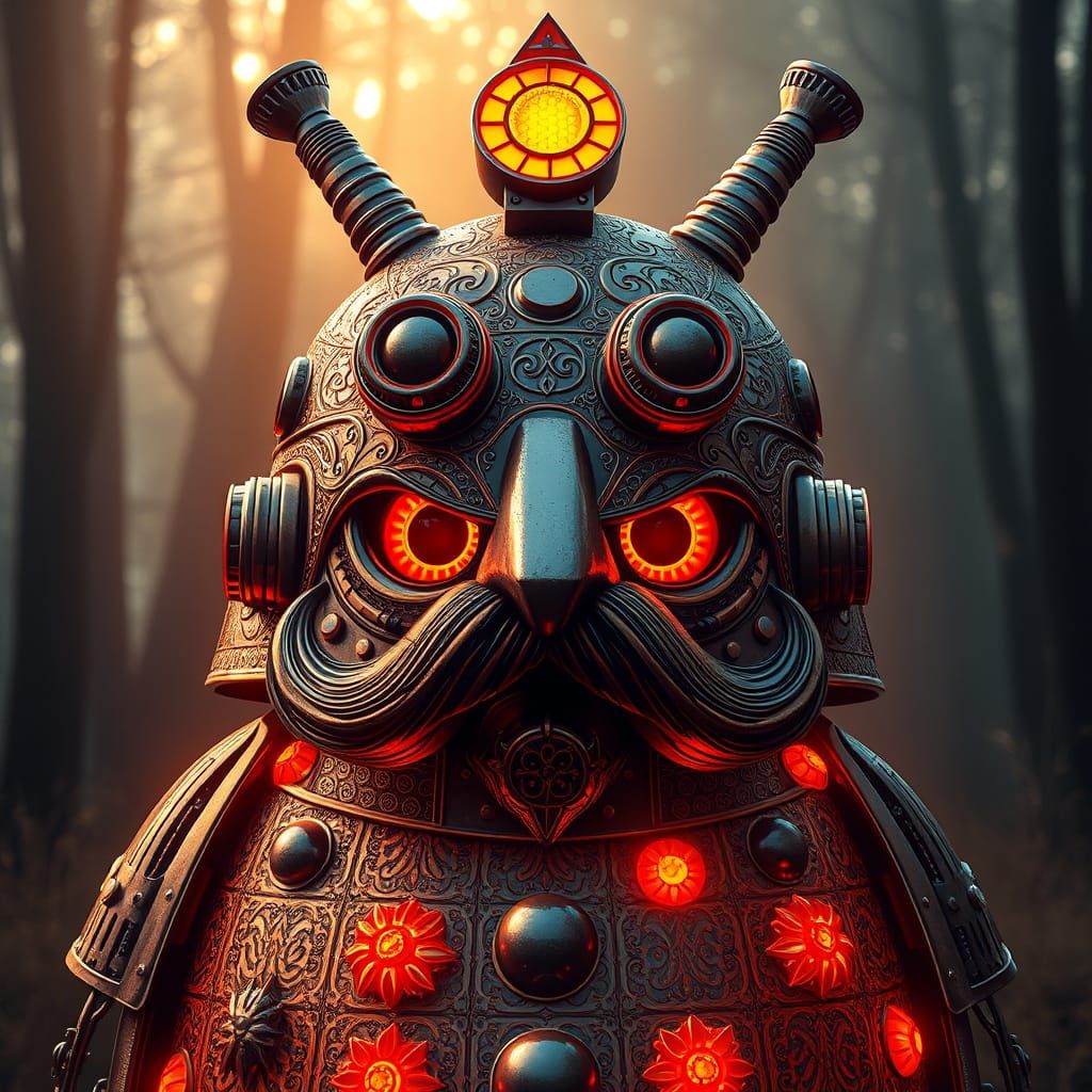 A surreal sci-fi art scene featuring a Turkish moustache-adorned Totoro Punk Dalek, intricately patterned with khokhloma designs, shining with a serious yet absurd expression in a hyper-detailed, luminescent setting