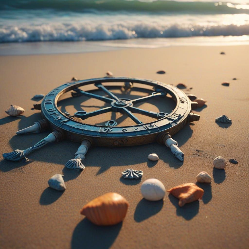 This cinematic film still captures a poignant moment of cosmic despair, as a dejected Aries and Pisces zodiac symbols sit amidst a desolate beach, surrounded by the remnants of broken dreams and scattered fish skeletons.