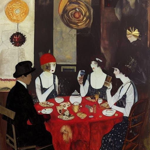 Collage art. A whimsical scene of a brothel in 1920s attire, attending a bizarre tea party in a dark brothel-like interior. Distressed textures, gold and red, vintage ephemera. A vibrant, clashing color palette. Art by Egon Schiele, Hannah Höch, Kurt Schwitters. Best quality, masterpiece.