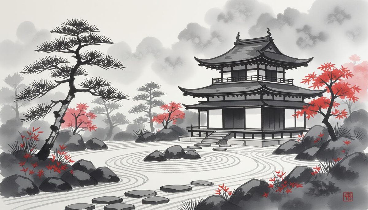 This image showcases a minimalist Japanese zen garden with a teahouse, rendered in an inksplash oil and graphite style. Subtle red accents add depth to the serene scene.