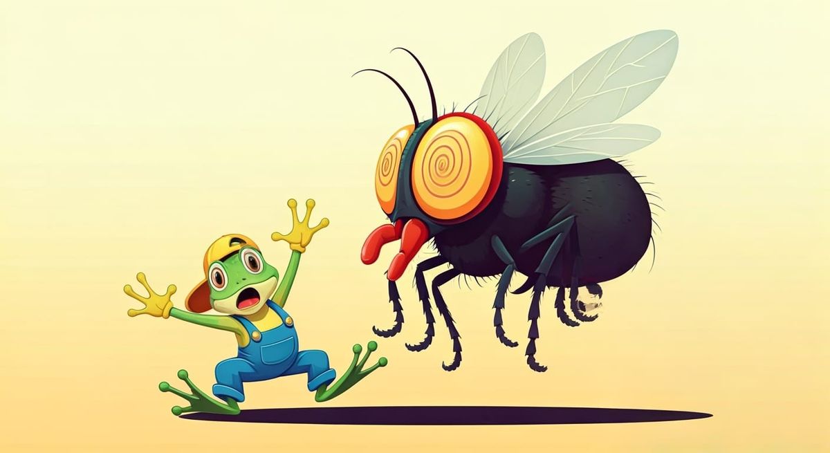 Cartoon of an anthropomorphic frog surprised as it is approached by a giant fly.