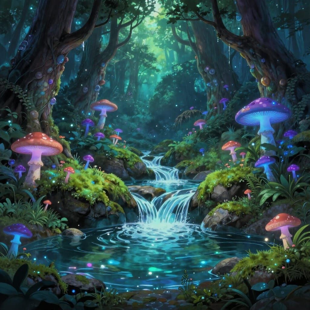 This image depicts a hidden oasis within a glowing mushroom forest. Luminescent spores fill the air, with waterfalls flowing into a clear pool, rendered in a detailed fantasy concept art style.